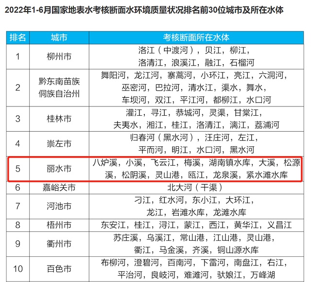 在今年上半年水環(huán)境質量前10名的榜單中,浙江省麗水市排名第5。前5月,168個重點城市空氣質量排名中,麗水位列第8。