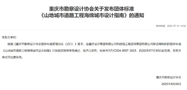 由重慶設計集團有限公司市政設計研究院主編的《山地城市道路工程海綿城市設計指南》于2025年7月30日起實施。主要內容涵蓋道路海綿指標的確定、計算方法、設施布局、設施設計及植物配置等關鍵環節,并針對當前道路海綿城市建設中存在的海綿指標界定不清、設施計算不規范、滯留帶收水效率低及植物景觀效果欠佳等問題提出了差異化解決方案,兼具適用性和可操作性。