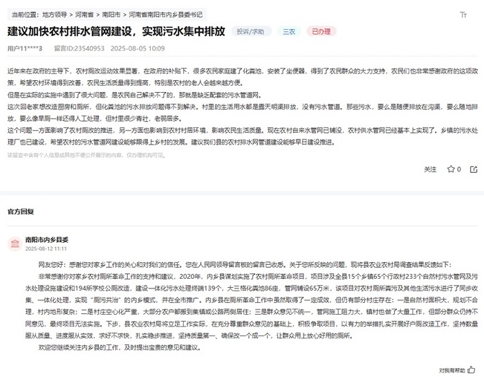 內(nèi)鄉(xiāng)縣農(nóng)業(yè)農(nóng)村局在回復(fù)中坦言,鄉(xiāng)鎮(zhèn)污水處理廠雖已建成,但管網(wǎng)配套仍是短板。“我們正積極爭取項目,以有力的舉措扎實開展好戶廁改造工作,堅持?jǐn)?shù)量服從質(zhì)量、進(jìn)度服從實效,求好不求快,扎實穩(wěn)步推進(jìn),堅持質(zhì)量第一,確保改一個成一個,讓群眾用上放心好用的廁所。”