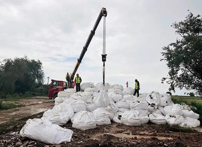 內(nèi)蒙古包頭市土默特右旗的搶險人員加快調(diào)運(yùn)噸包等防汛物資(2025年8月10日攝)王靖攝