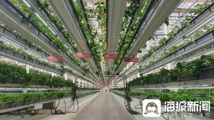 園區內2000余畝的現代農業產業園重點發展了草莓、櫻桃、鱸魚養殖三大產業。連片的草莓棚采用精準滴灌技術,根據植物不同生長期的需求,通過芯片精準控制滴灌水量,全自動水肥閉合循環系統可收集和重新利用營養液,實現水和肥料的循環利用,實現單株耗水節約66%。在櫻桃大棚里,則靠著人工智能控制技術,給櫻桃樹“變換四季”,實現錯峰成熟,填補國內2、3、4月優質櫻桃的市場空白期。